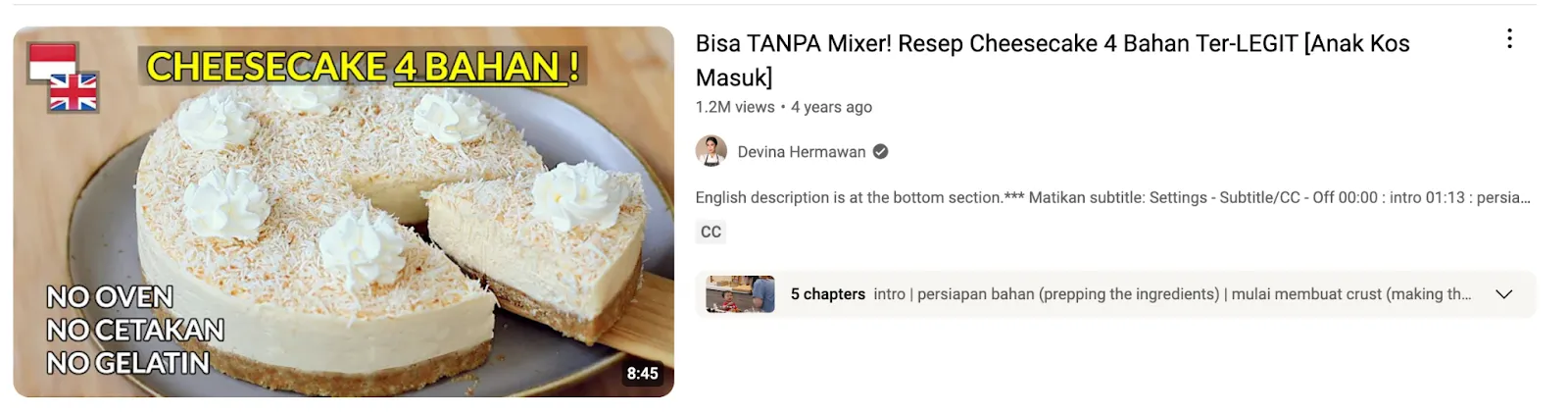 Video di atas mengenalkan resep cheesecake yang hanya memerlukan 4 bahan, dengan judul yang menarik "Bisa TANPA Mixer! Resep Cheesecake 4 Bahan Ter-LEGIT [Anak Kos Masuk]".